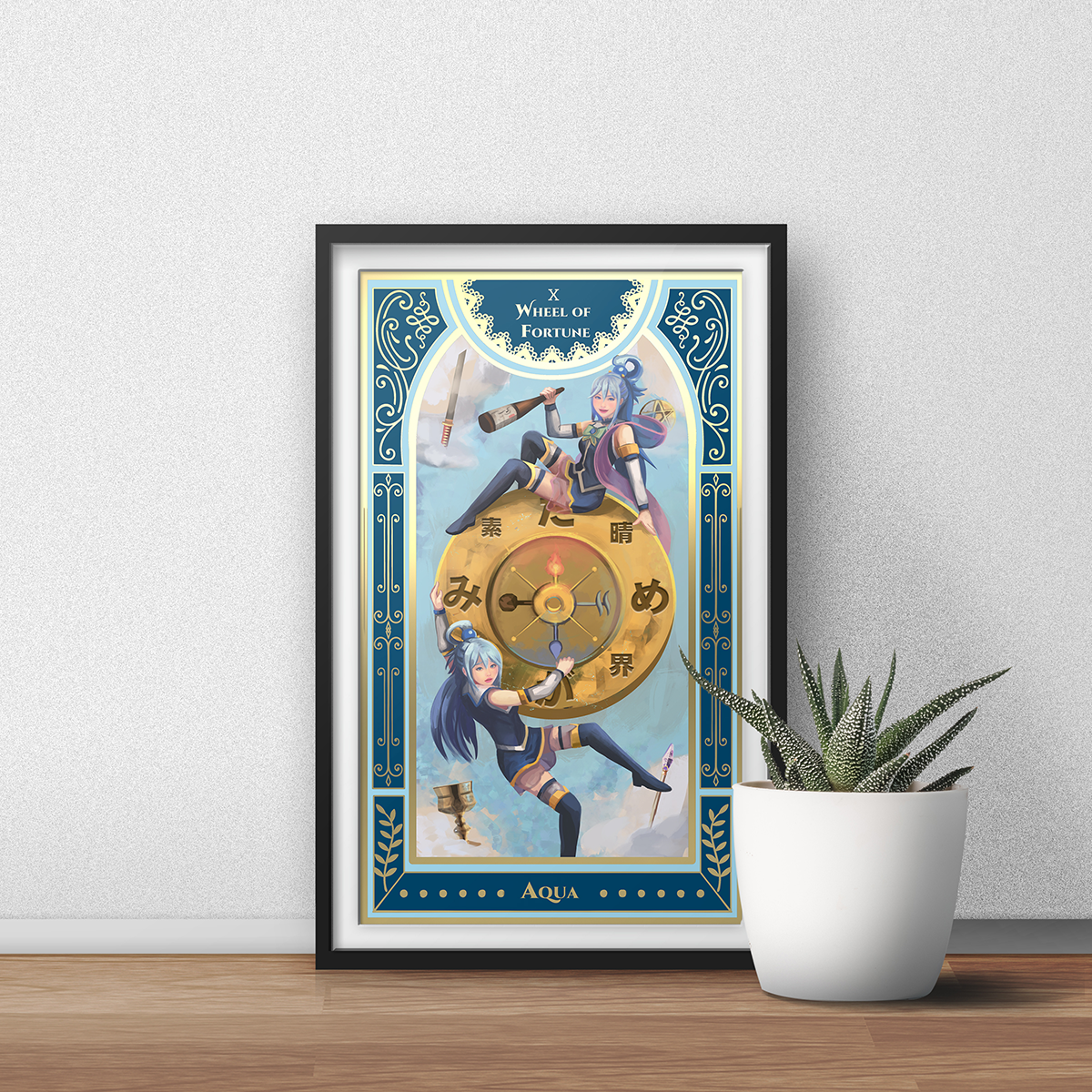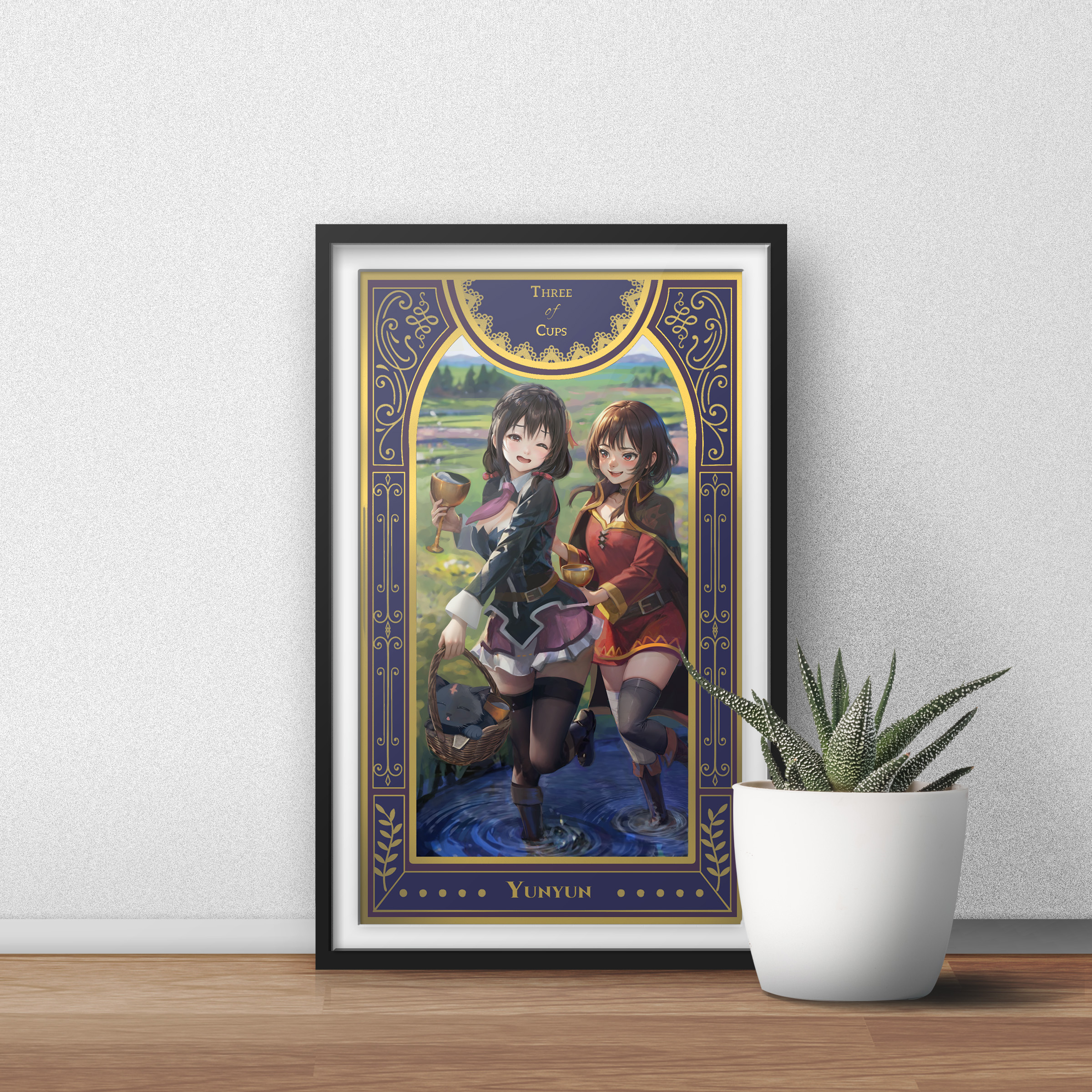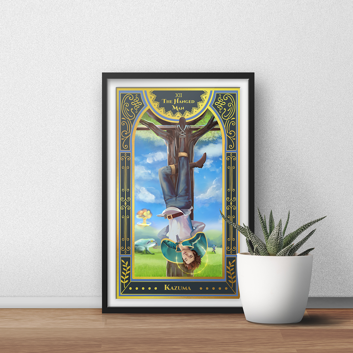 Each character is depicted in the traditional tarot deck fashion, complete with symbols reflective of their meaning. Choose from the cast of Konosuba characters digitally painted in original oil painting style. Gold-ink gilded collectors prints for my Isekai Tarot Deck. Frame is not included in the purchase.