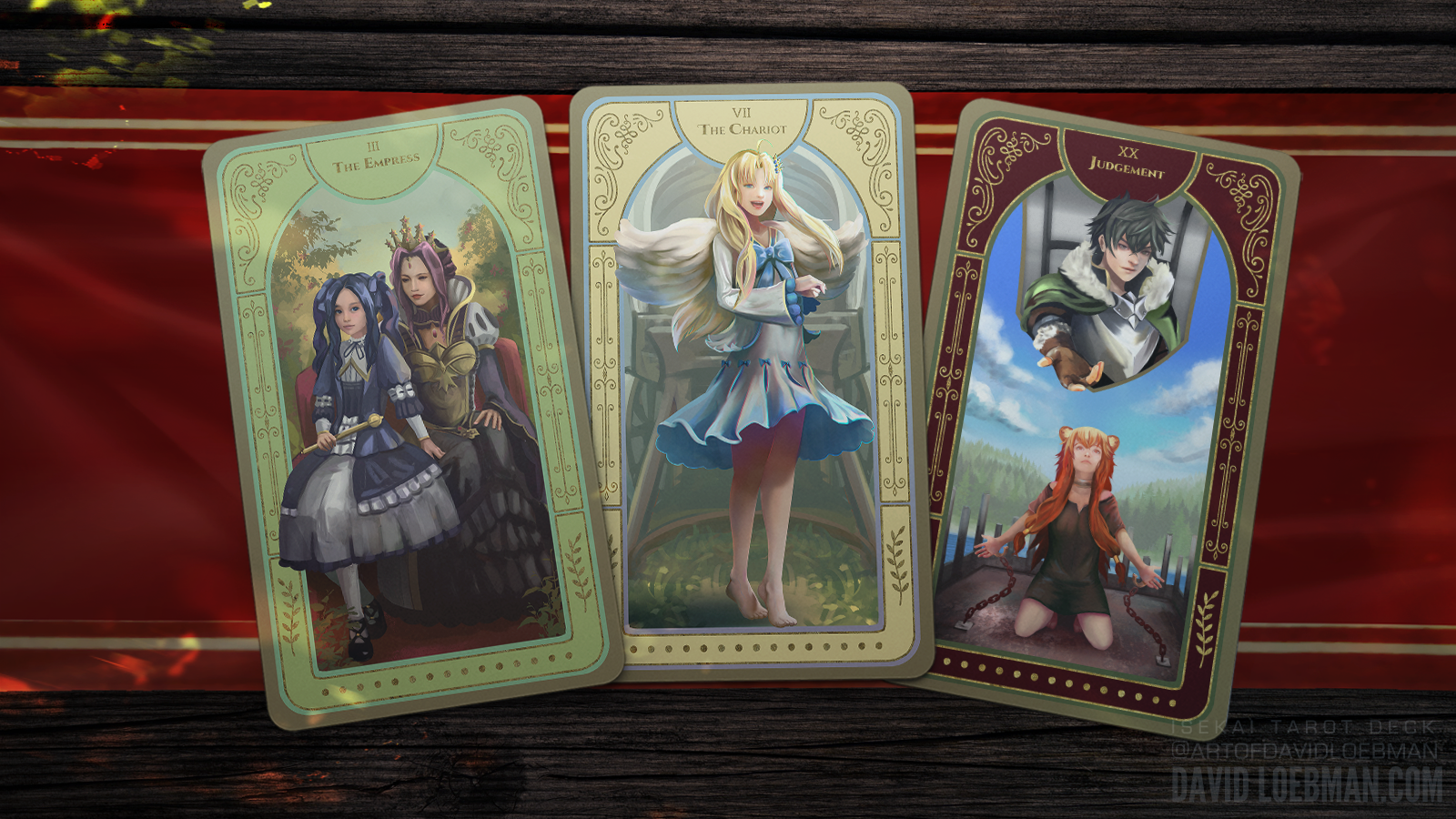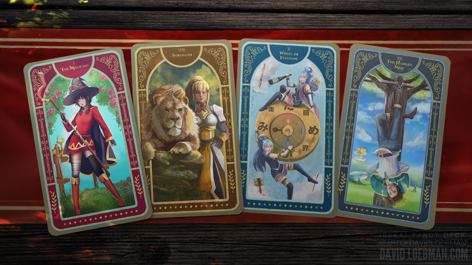Tarot card designs with characters from popular isekai anime, illustrated in classic oil painting style! Foretell the future alongside your favorite isekai anime characters. Each card presented as a gold-adorned digital oil-painting.