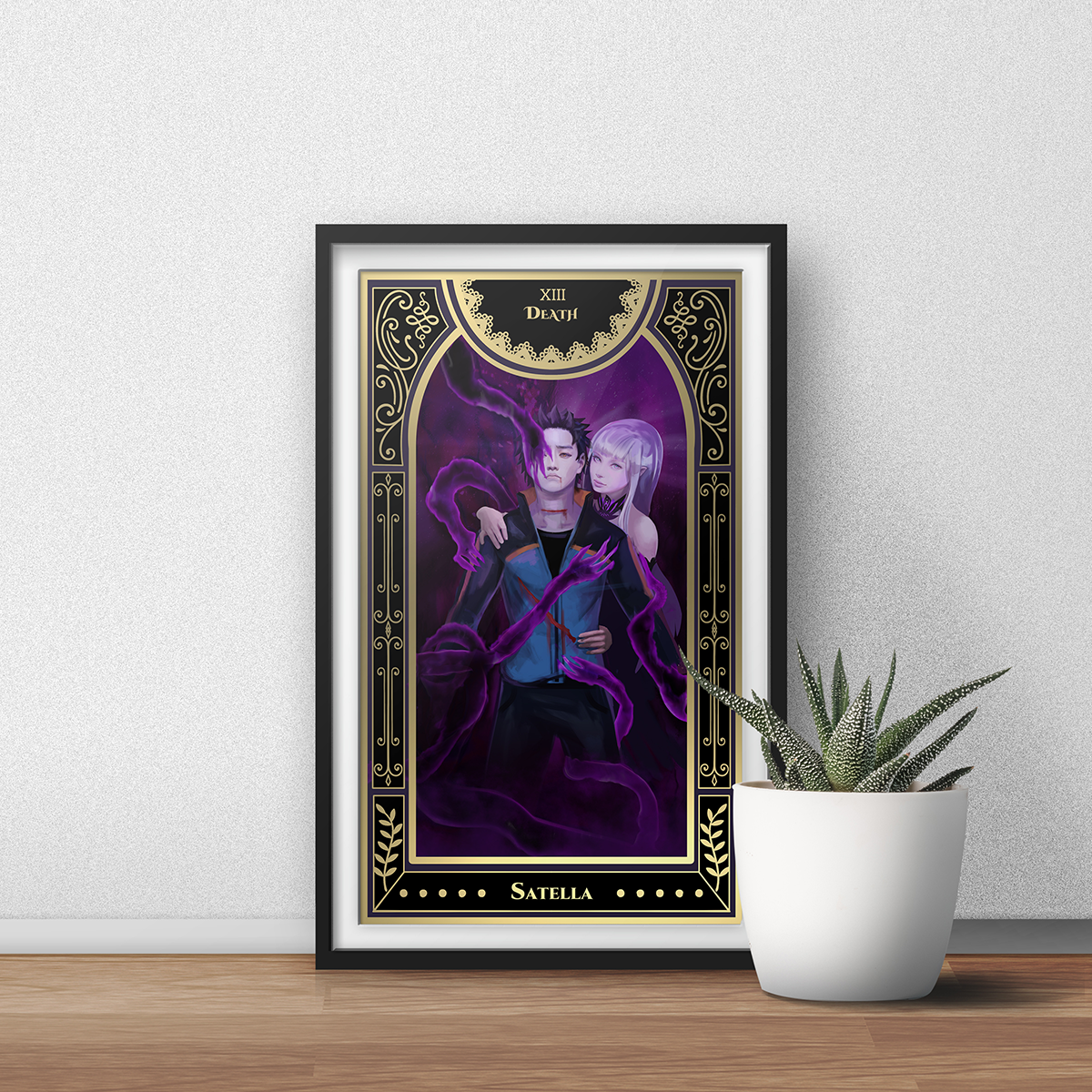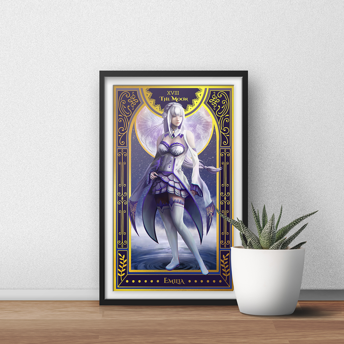 Each character is depicted in the traditional tarot deck fashion, complete with symbols reflective of their meaning. Choose from the cast of Re:Zero characters digitally painted in original oil painting style. Gold-ink gilded collectors prints for my Isekai Tarot Deck. Frame is not included in the purchase.