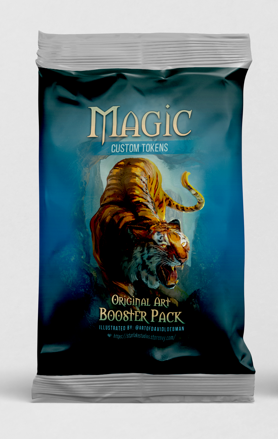 ⭐ Each 10-card booster pack contains tokens with original art illustrated by me, sized at 2.5" x 3.5", and printed on thick 330 gsm cardstock comparable to an MtG card. They will fit perfectly in any standard-sized sleeve. Please note that the reverse of each card is black