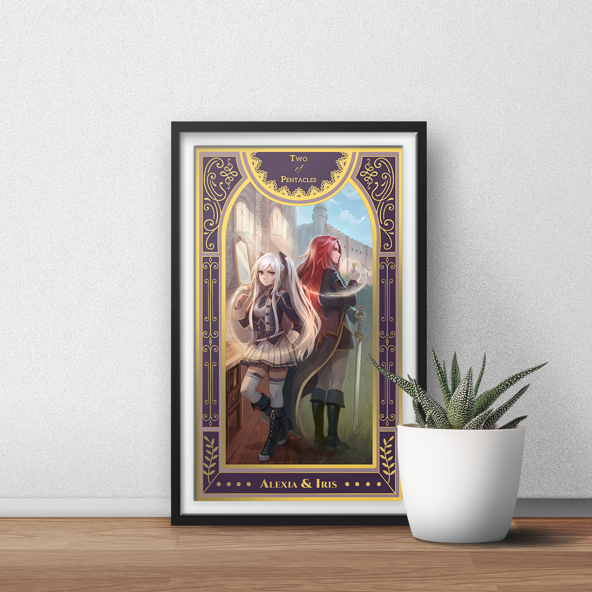 Each character is depicted in the traditional tarot deck fashion, complete with symbols reflective of their meaning. Gold-ink gilded collectors prints for my Isekai Tarot Deck. Frame is not included in the purchase.
